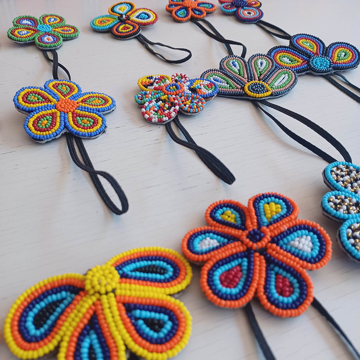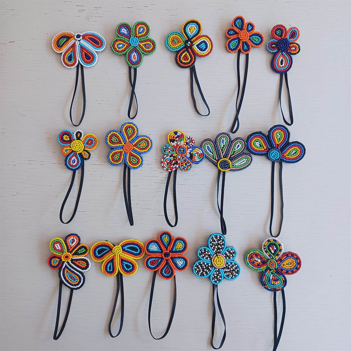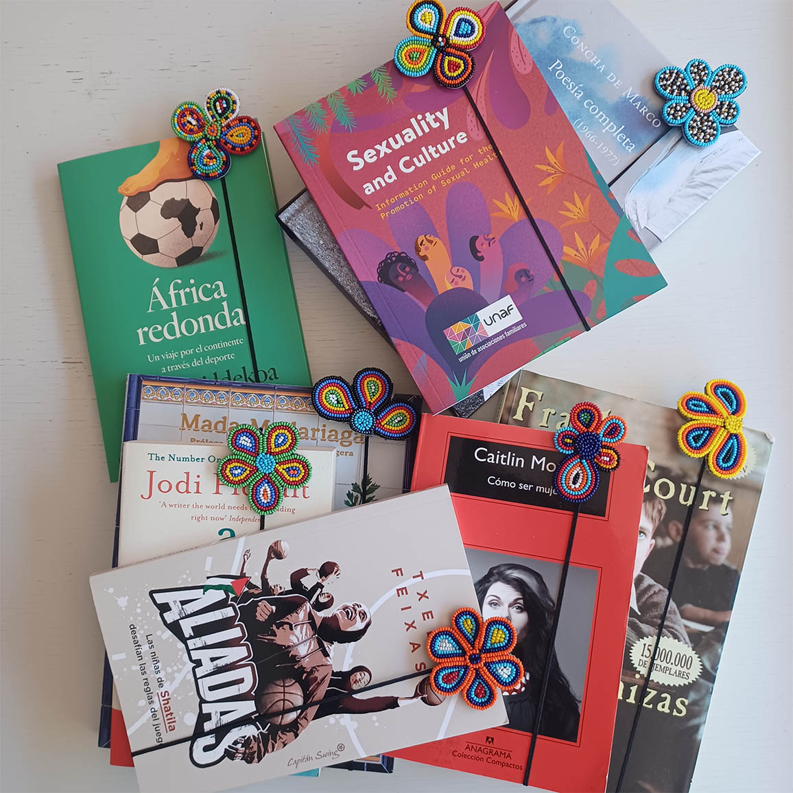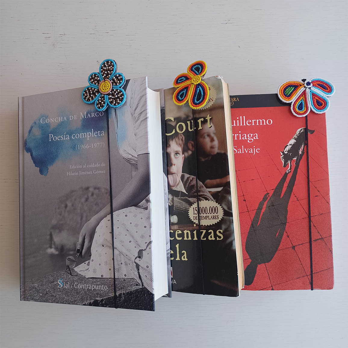 Marcapáginas decorativos para darle un toque muy original y solidario a tus libros. Hechos con flores muy originales, usando las tradicionales cuentas de cristal de colores tan típicas en la cultura masai, cosidas a mano sobre cuero, con reverso de polipiel. Cada flor es única y diferente. Lee cómodamente sin perderte y admira en cada página esta maravillosa artesanía.